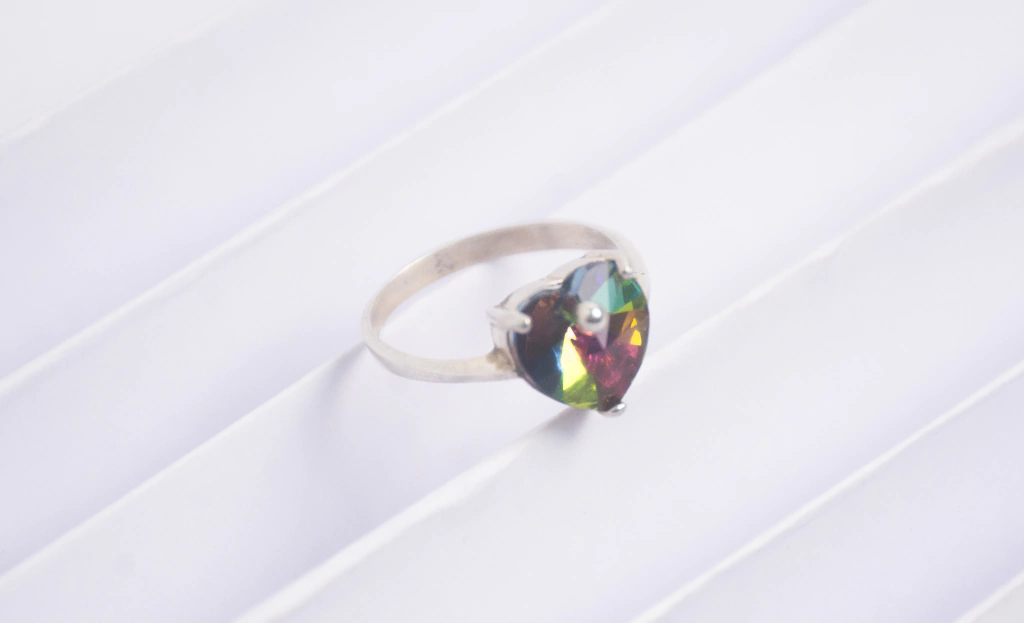 Descubra la elegancia del Anillo Litmus, fabricado en plata 925 de alta calidad. Este deslumbrante anillo presenta un cubic tornasolado en forma de corazón, que irradia un brillo cautivador y un estilo único.
