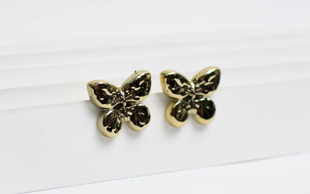 Descubra la belleza de nuestros aros pasantes de mariposas, elaborados en acero dorado inflado. Su diseño delicado y super liviano los convierte en la elección perfecta para complementar su look diario o una ocasión especial.