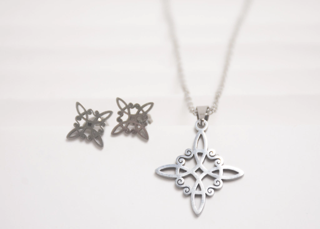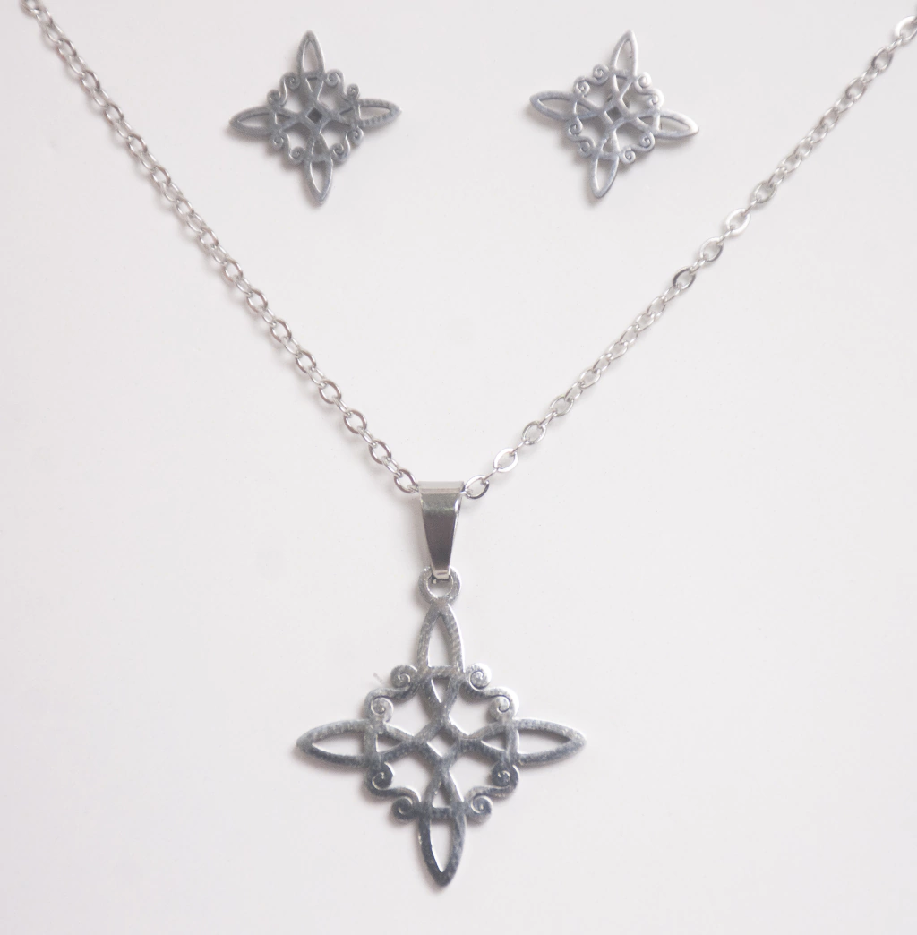 Descubra la sofisticación del Conjunto Nudo de Bruja, una pieza esencial para su colección de joyas. Este conjunto incluye una hermosa cadena, un dije encantador y aros, todos elaborados en acero quirúrgico y también disponibles en dorado.